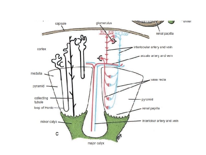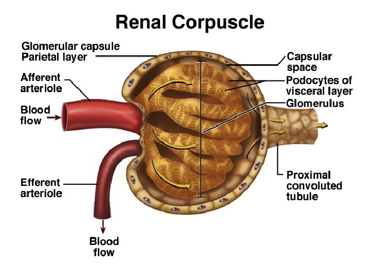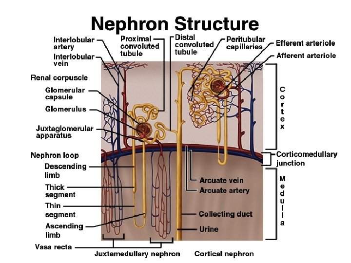 Blood vessels servicing kidney • Supplied by renal artery – ~21% or cardiac output – (Mass in only ~ 0. 4%) – Afferent arterioles – Capillary cluster (glomerulus)