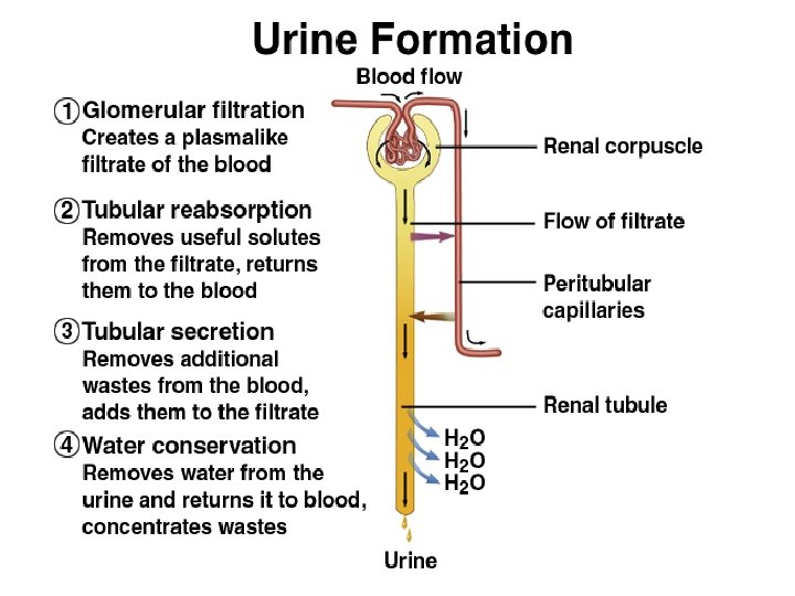 URINE FORMATION Overview • Blood plasma Urine • Four steps – Glomerular filtration – Tubular reabsorption – Tubular secretion – Water conservation