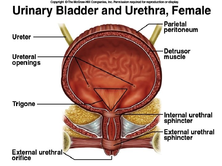 Urethra • 3 – 4 cm long in females – Bound by connective tissue to anterior wall of vagina – Urethral orifice exits body between vaginal orifice and clitoris