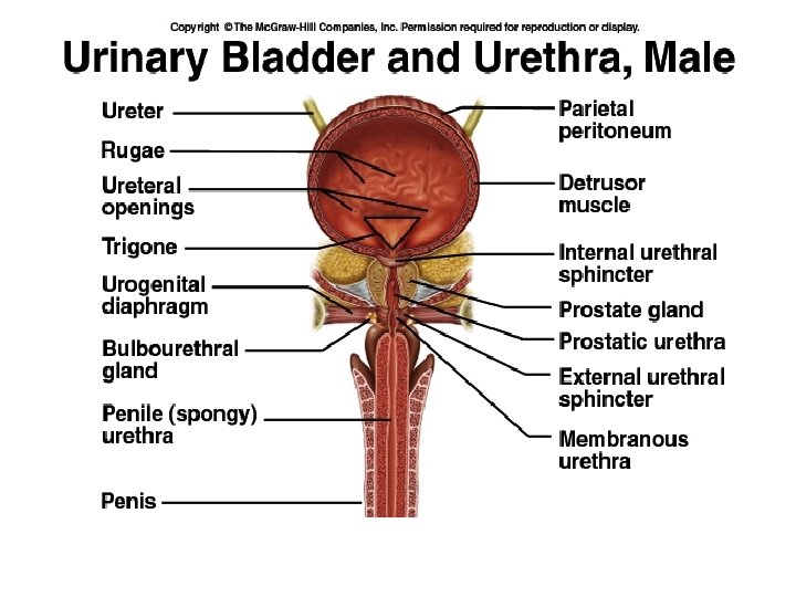 Urethra • ~18 cm long in males – Prostatic urethra • ~2. 5 cm long, urinary bladder prostate – Membranous urethra • ~0. 5 cm, passes through floor of pelvic cavity – Penile urethra • ~15 cm long, passes through penis