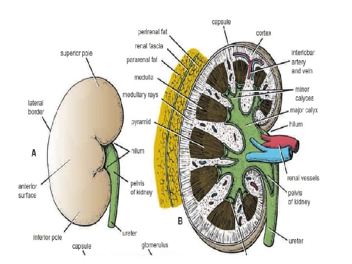 Cortex Medulla Renal hilum Renal artery Renal vein Renal pelvis Ureter Cortex Glomeruli Medulla Renal tubules (with calyces forming the medulary pyramids) Ureter Takes urine to bladder Blood carried to the kidney by the renal artery and taken away by the renal vein.