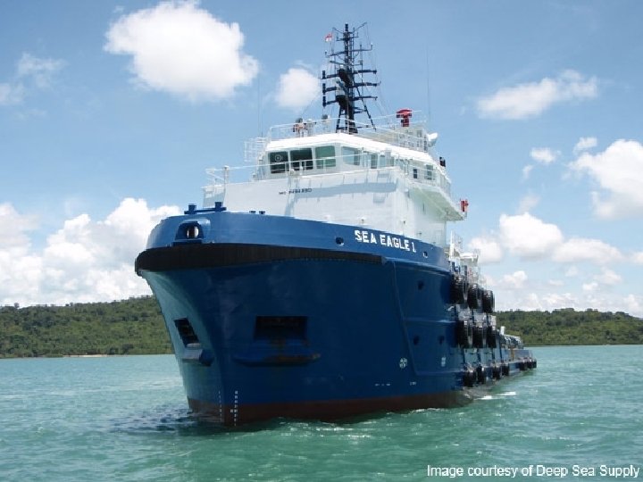 Towage Services • Anchor handling tug supply (AHTS) vessels tow oil drilling rigs or jacket platforms to their location and back, behaving like an ordinary tug. • For towing Anchor handling tug supply (AHTS) vessels have very high power engines (~12000 bhp) for an enhanced towing and anchor handling capacity. They have more power to increase the bollard pull. –*Sea Eagle 1* • Modern vessels are capable of positioning and mooring drilling rigs in any location, at virtually any depth and under any conditions. – *TIDEWATER*