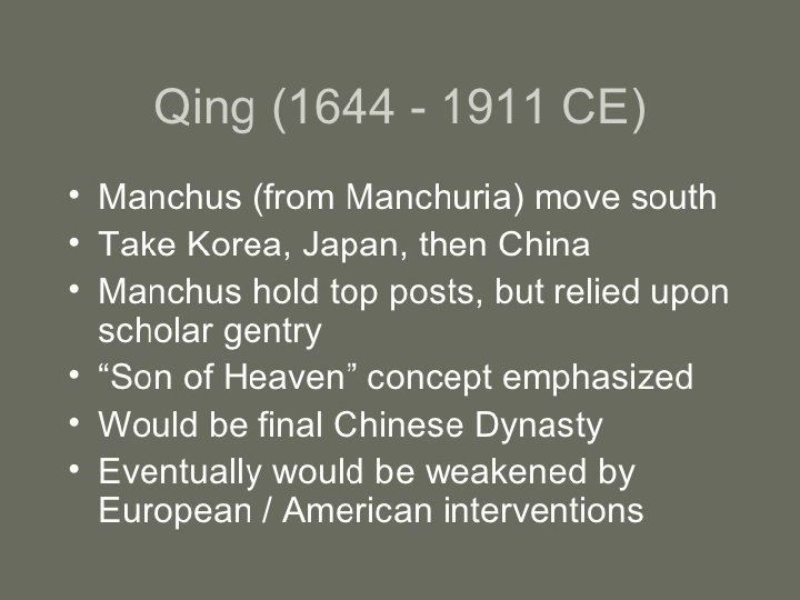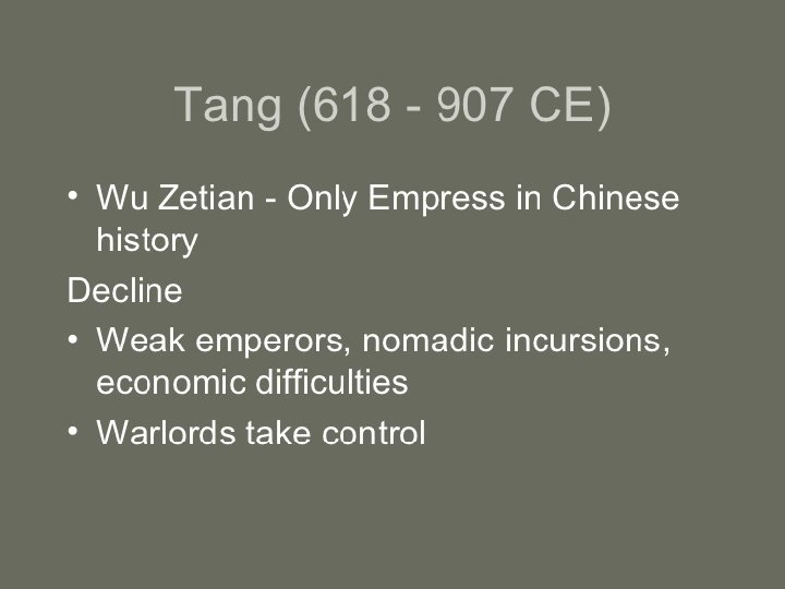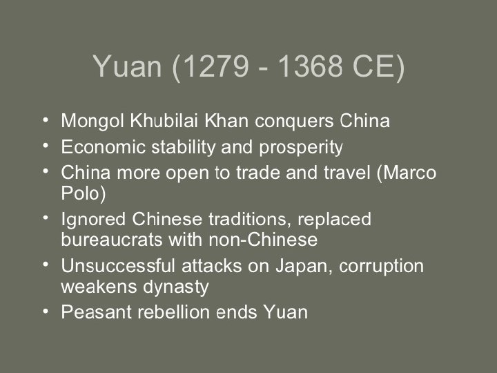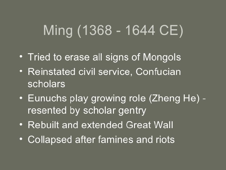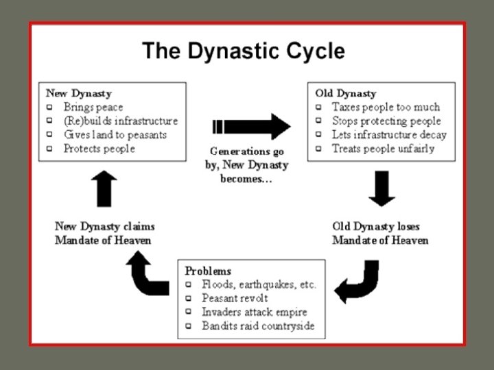 • Ancient Chinese Dynasties • Dynastic cycle • Philosophies of the times • Crazy rulers