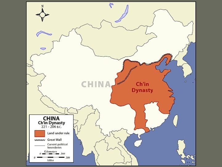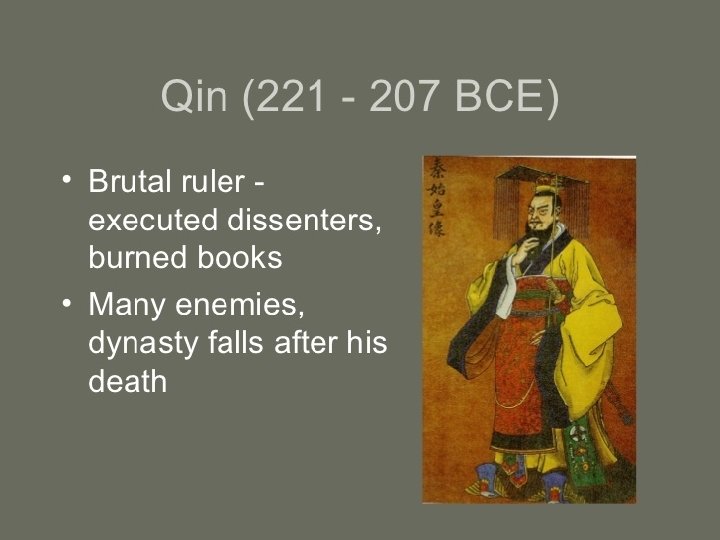 Came to throne at age 13 Brutal Leader Created single monetary system Began building roads throughout empire Reduced powers of aristocrats Split up their lands Gave to peasants Taxed directly by the state Legalism – changed Chinese Politics dramatically Punishment, including death if opposed Extended China south Began building a series of walls to the north Protection from the Xiongnu (SHYUNG-NOO) “Wall of 10, 000 Li” United China