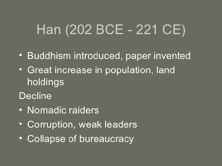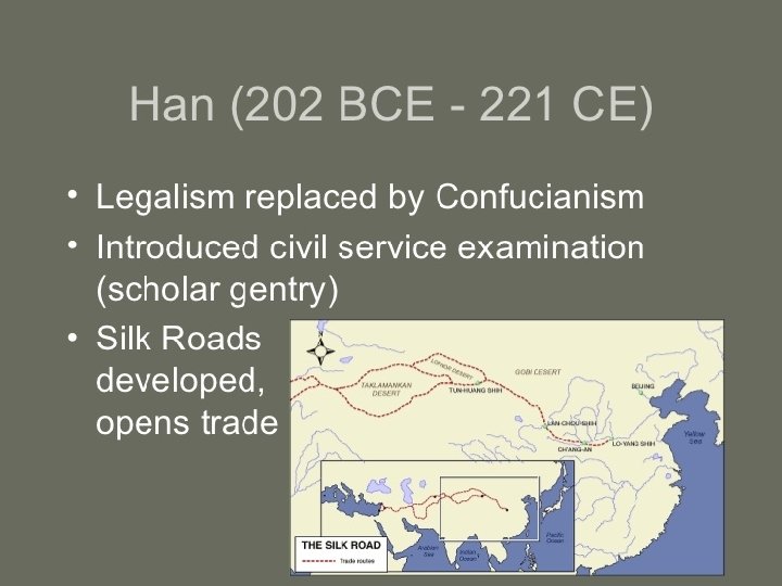 Han Dynasty • Liu Pang – Changed name to Han Gaozu – Strong ruler – Continued some of Qin Dynasty’s traditions: • Division of government – Military, civil service, censorate – Choosing officials based on merit, rather than birth