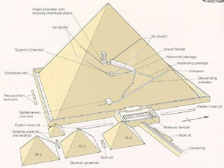 II. Great Pyramid • Tomb for Khufu • an almost perfect square (deviation. 05%) • Orientation is exactly North, South, East West • 2, 300, 000 blocks, 500 ft high • 20 years to build • Average block weighs 2. 5 tons – Some weigh 9 tons! 1 2 3 4 5 6