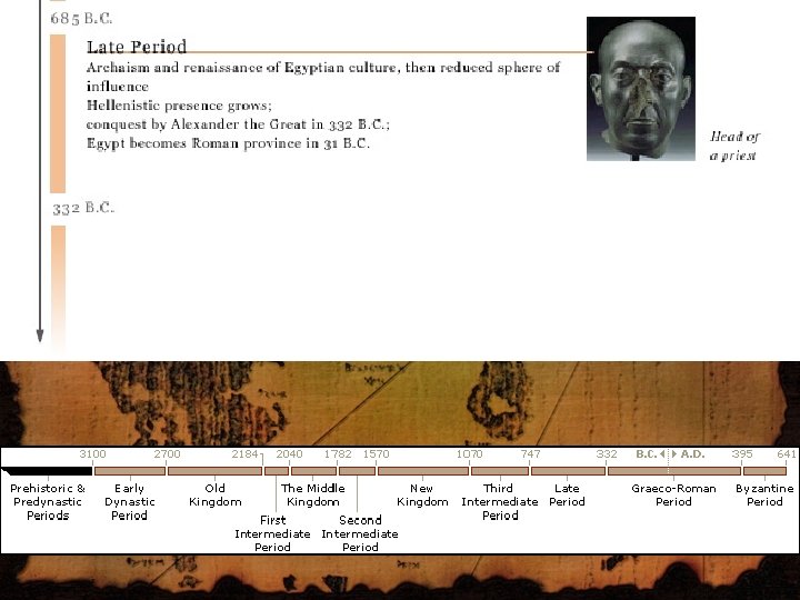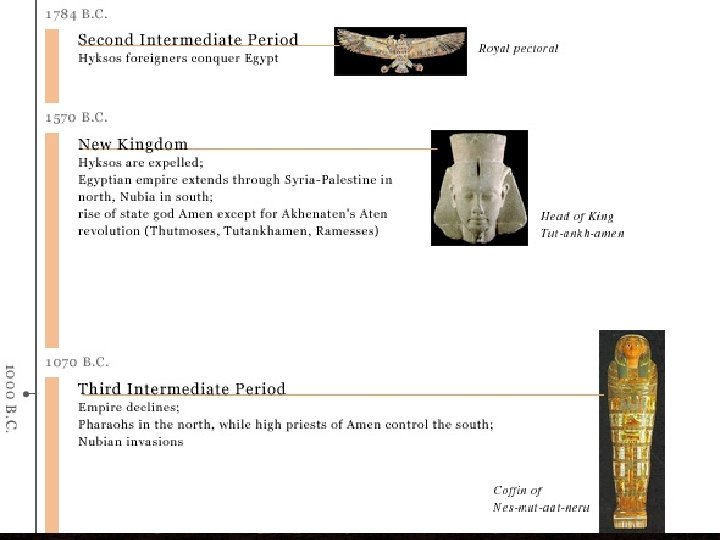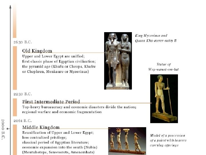 From Dynasty to Dynasty Ancient Egypt has a history of dynasties. A dynasty is a family of rulers. Egypt had 31 dynasties before it was conquered by the Greeks in 332 B. C. Historians separate Egyptian history into three main time periods, which they call kingdoms. The time periods are called the Old Kingdom, the Middle Kingdom, and the New Kingdom. Old Kingdom* 2575 BC - 2150 BC Middle Kingdom 2040 BC - 1640 BC New Kingdom 1540 BC - 1070 BC * The dates in this table are not exact.
