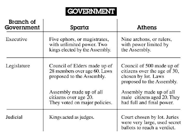 Two Different Governments Athens Sparta • Democratic- a • Totalitarian- A political system in which the political system supreme power based on absolute lies in a body of power of a single citizens who can party or dictator. elect people to represent them
