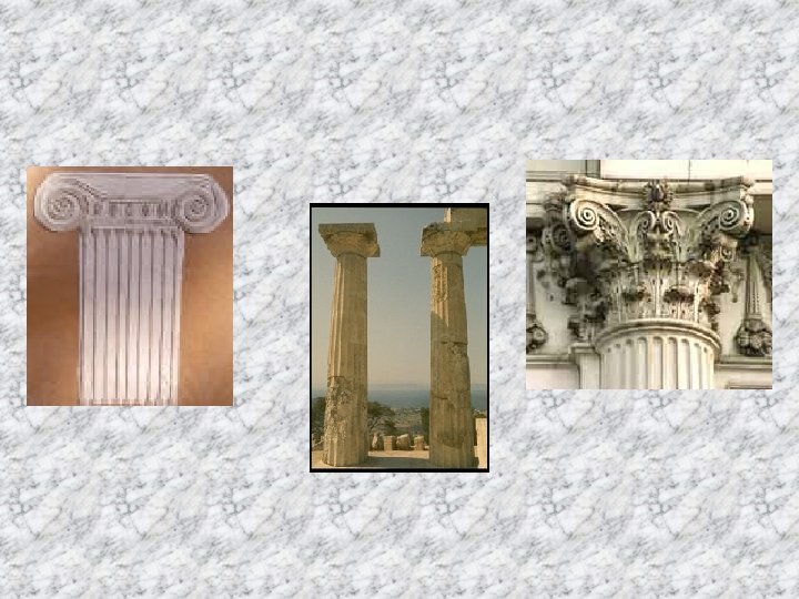 Temples & Architecture • 3 major forms of architecture: Doric, Ionic and Corinthian • Identified via columns • Doric: ring under square platform, square/rectangular structure of building • Ionic: two scrolls on either side, square/rectangular structure of building • Corinthian: elaborate detailing on upper column, round structure of building