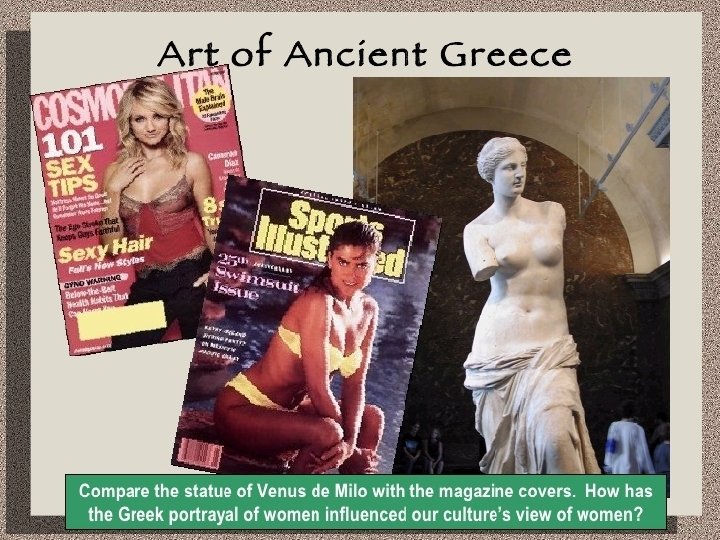 Ancient Greek Art n n Most of the ancient Greek art that is still around today is in the forms of pottery, sculpture and architecture. Most ancient Greek paintings have deteriorated or been destroyed, except for most paintings on pottery. q Why are they gone? n n n Greek painters worked mainly on wooden panels, which deteriorated over time. One of the sad facts of ancient history is that when marble is burned, lime is produced, and that was also the fate of the great bulk of Greek marble statuary during the Middle Ages. Likewise, the shortage of metal during the Middle Ages led to the majority of Greek bronze statues being melted down. Those statues which had survived did so primarily because they had been buried and forgotten, or as in the case of bronzes having been lost at sea. The great majority of Greek buildings have not survived to this day: either they had been pillaged in war, had been looted for building materials or had been destroyed in Greece’s many earthquakes. Only a handful of temples, such as the Parthenon and the Temple of Hephaestus in Athens, have been spared.