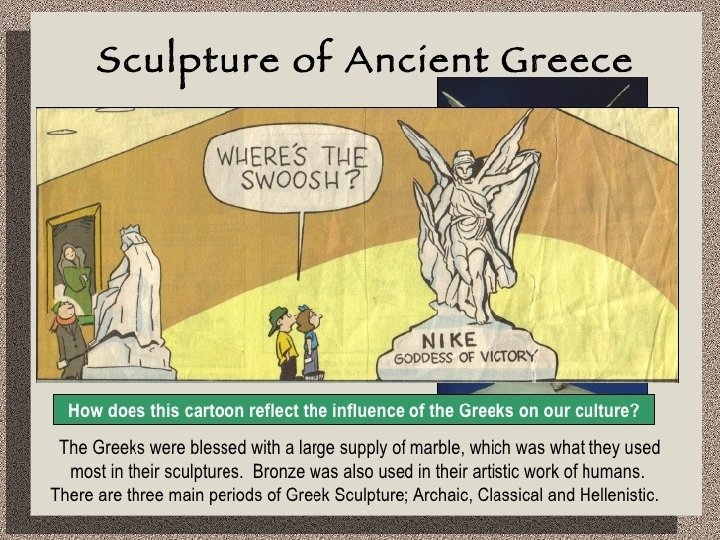 Sculpture n n n Marble & Bronze Human form the most important subject Few sculptures have survived, mostly in Roman copies