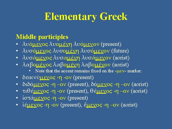Elementary Greek Middle participles • All participles in the middle voice have the marker -μεν-. • All participles in the middle voice use –ος –η –ον endings. • In other words, wherever the personal ending (or infinitive ending) would be, substitute: –μενος –μένη –μενον