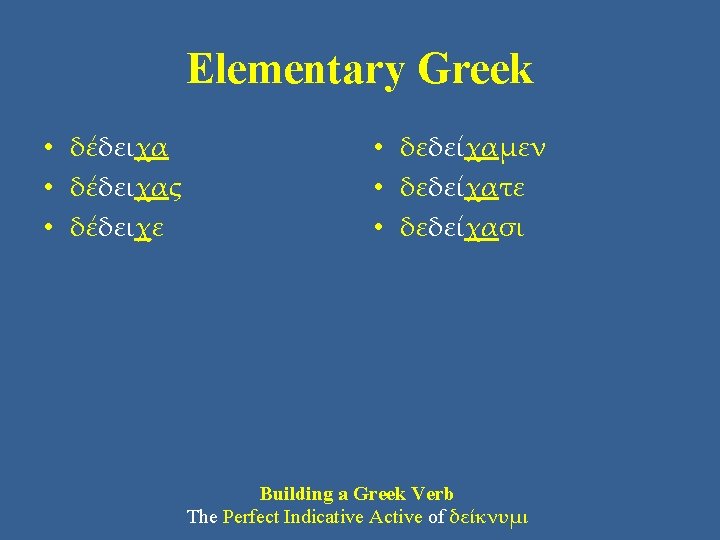 Elementary Greek The Perfect System • Greek tenses of the perfect system use distinctive markers: – ALL verbs in the perfect system double the initial sound of the verb’s stem. This addition is called the “reduplication. ” – In the active voice, the perfect stem add the marker –κα. When adding –κα to the verb stem is too difficult to pronounce, the –κ merges or drops out. – λυ λελυ- (perfect stem) • + –κα λελυκα- (perfect active stem) – δεικ δεδεικ- (perfect stem) • + –κα δεδειχα- (perfect active stem)