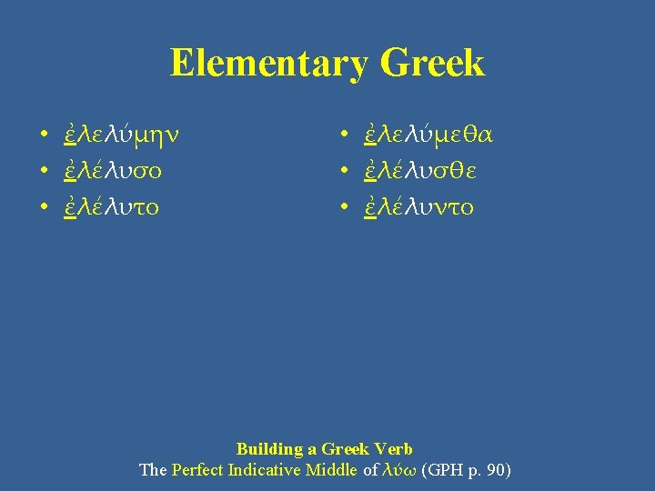 Elementary Greek Building a Greek verb • In the middle voice, the Pluperfect Tense uses secondary endings: • -μην = I (1 st sg) -μεθα = we (1 st pl) • -σο = you (2 nd sg) -σθε = y’all (2 nd pl) • -το = (s)he, it (3 rd sg) -ντο = they (3 rd pl) These endings are the standard ones from the Secondary Personal Endings on the Master List of Greek Endings.