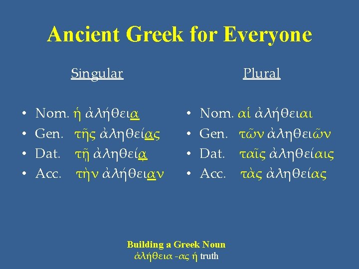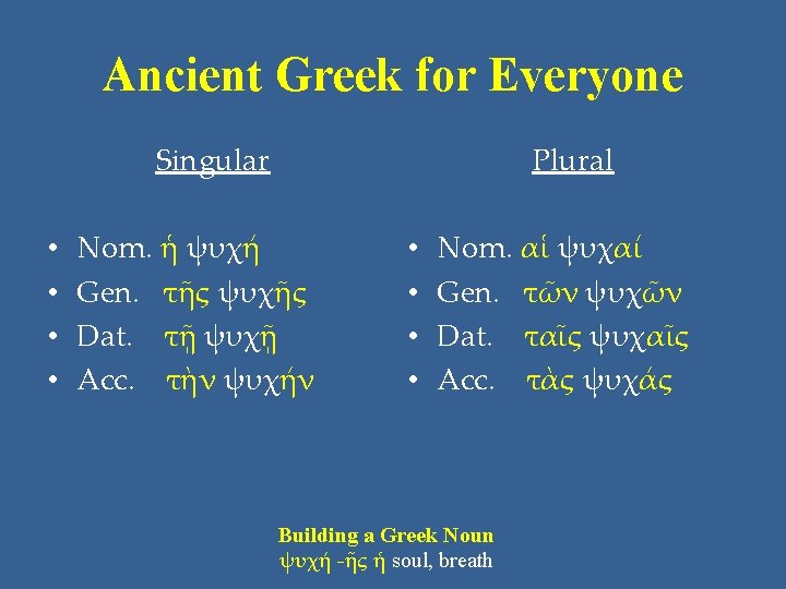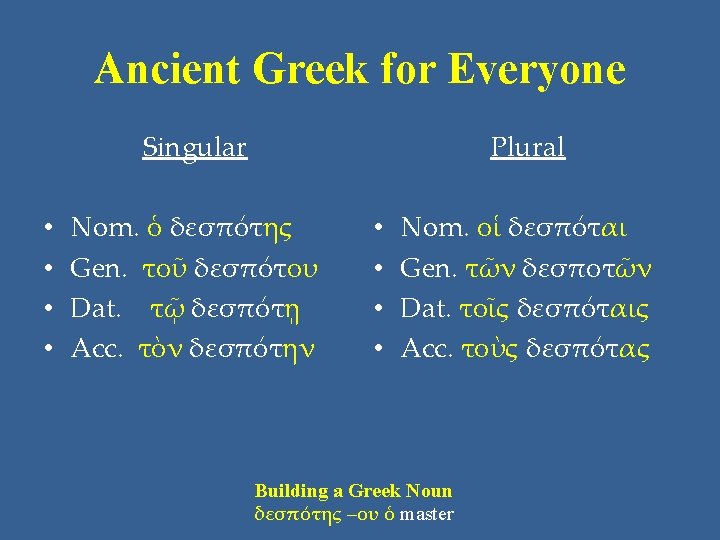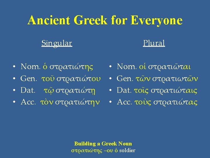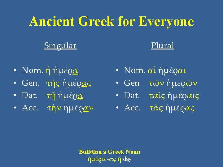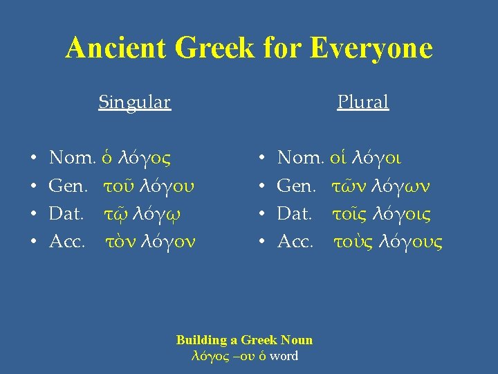 Ancient Greek for Everyone Singular • • Nom. ἡ δόξα Gen. τῆς δόξης Dat. τῇ δόξῃ Acc. τὴν δόξαν Plural • • Nom. αἱ δόξαι Gen. τῶν δοξῶν Dat. ταῖς δόξαις Acc. τὰς δόξας Building a Greek Noun δόξα -ας ἡ glory, judgment, opinion