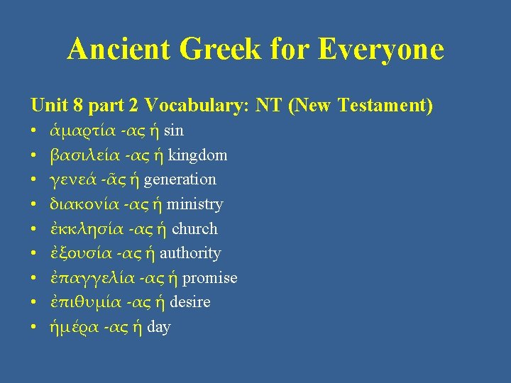 Ancient Greek for Everyone Unit 8 part 2 Vocabulary: NT (New Testament) • • ἀλήθεια -ας ἡ truth γλῶσσα -ης ἡ tongue, language δόξα -ης ἡ opinion, judgment, glory θάλασσα -ης ἡ sea