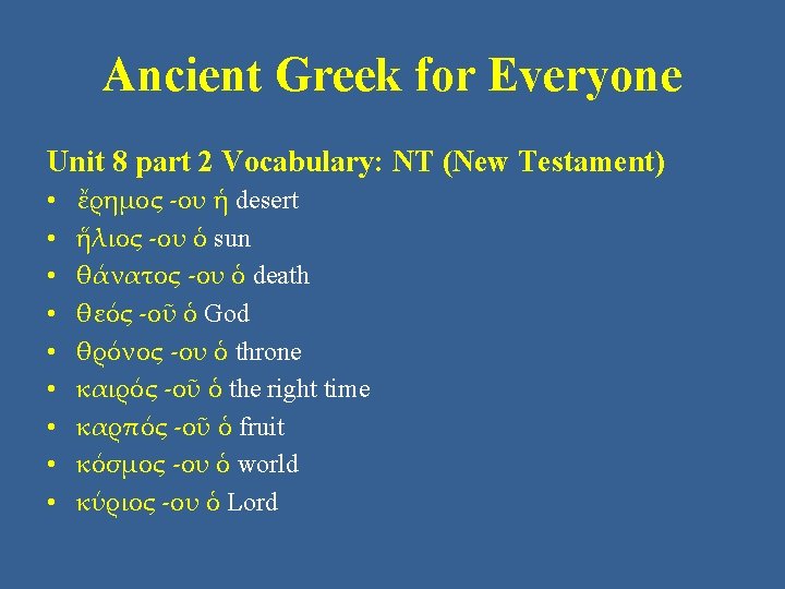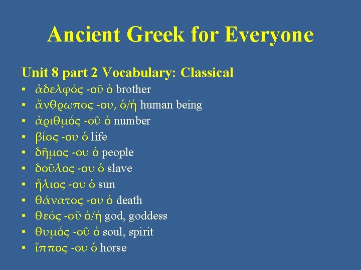 Ancient Greek for Everyone Unit 8 part 2 Vocabulary: Core • • ἀδελφός -οῦ ὁ brother ἄνθρωπος -ου, ὁ/ἡ human being δοῦλος -ου ὁ slave ἥλιος -ου ὁ sun θάνατος -ου ὁ death θεός -οῦ ὁ/ἡ god, goddess καιρός -οῦ ὁ the right time κύριος -ου ὁ lord, master