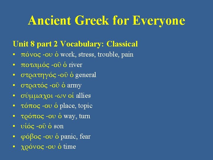 Ancient Greek for Everyone Unit 8 part 2 Vocabulary: Classical • δεσπότης -ου ὁ master • ποιητής -οῦ ὁ creator, poet • στρατιώτης -ου ὁ soldier