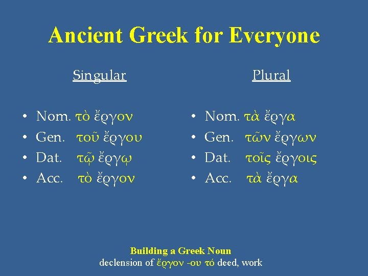 Ancient Greek for Everyone The Declensions of Greek Nouns • In formal grammar, Greek nouns are classified by the last sound of their stems, which may in turn contract with the case endings. • There are traditionally three of these classes, called “declensions. ” • All the nouns you have learned so far belong to the “Third Declension. ” • This section presents the other two Declensions.