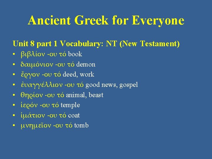 Ancient Greek for Everyone Unit 8 part 2 Vocabulary: NT (New Testament) • • • ἄγγελος –ου ὁ messenger, angel ἀγρός -οῦ ὁ field, farm ἀδελφός -οῦ ὁ brother ἄνεμος -ου ὁ wind ἄνθρωπος -ου ὁ human being ἀπόστολος -ου ὁ apostle ἄρτος -ου ὁ bread διάβολος -ου ὁ deceiver, slanderer διδάσκολος -ου ὁ teacher δοῦλος -ου ὁ slave