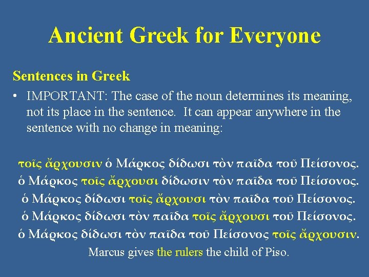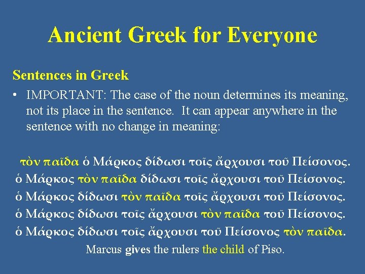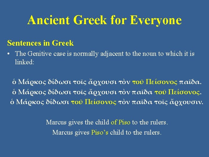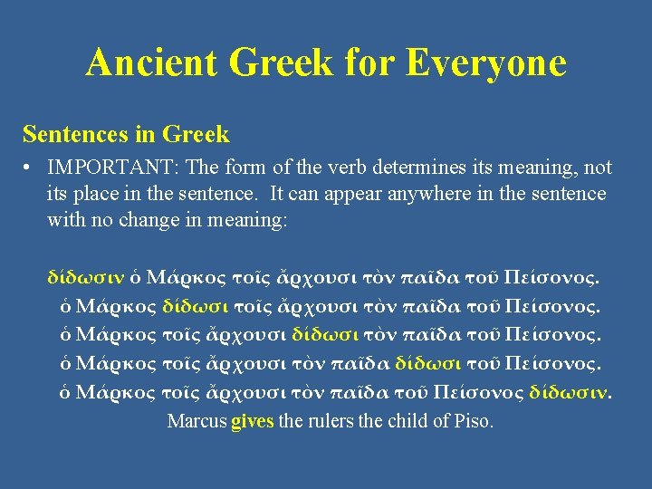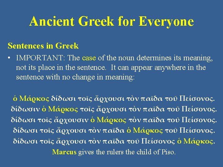 Ancient Greek for Everyone Sentences in Greek • We will use the sentence below as an example: ὁ Μάρκος δίδωσι τοῖς ἄρχουσι τὸν παῖδα τοῦ Πείσονος. Marcus gives the rulers the child of Piso.