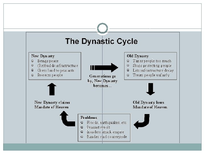 Determine what these indicate about a dynasty? Brings peace Lets Infrastructure decay Floods, Earthquakes, etc. Treats people unfairly Taxes people too much Bandits raid countryside Stops protecting people Protects people (re)builds infrastructure Invaders attack empire Peasant revolt Gives land to peasants