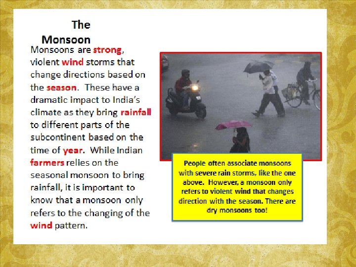 India’s Rivers India's rivers are crucial to daily life; they provide fresh drinking water, water for crops, and even electricity for the 1. 1 billion Indians that now inhabit the region. Two of India’s greatest rivers are the Ganges and the Indus. The source of both rivers rests high up in the Himalaya Mountains. Here, glaciers and snow melt to provide the flow of water for India’s rivers. As the water rushes down the mountainside, it fans out into a wide plain known as the Indo -Gangetic Plain. Indo-Gangetic Plain Indus River Ganges River Due to the flooding and the silt left behind, soil is very rich here. Also, this has led to the area being very densely populated.