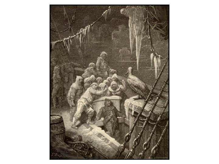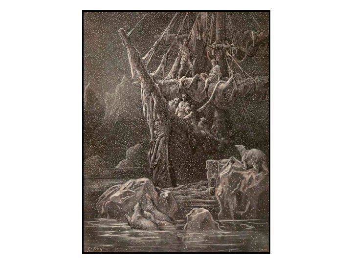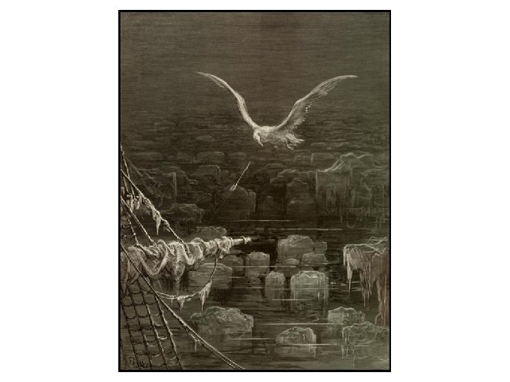 Stanzas 19 & 20 In mist or cloud, on mast or shroud, It perched for vespers nine; (75) Whiles all the night, through fog-smoke white, Glimmered the white Moon-shine. • “God save thee, ancient Mariner! From the fiends, that plague thee thus!— Why look'st thou so? ”—With my cross-bow(80) I shot the Albatross. • (Gloss: The ancient Mariner inhospitably killeth the pious bird of good omen. ) • • • “Vespers” alludes to a Catholic/Anglican prayer service held in the evening. Coupled with “nine”, it suggests the bird has been with the vessel for 9 evenings. Visibility remains low, and the bird seems to provide the boat with safe passage. REPETITION: “White” is a safe, or at least neutral color. In this case, the white fog competes with the white moon-shine. An eruption from the Wedding Guest startles the reader. Apparently, the Mariner’s visage has become disturbing as he recounts his tale. From the Wedding Guest’s outburst, we discern that to this day the Mariner is haunted/plagued by his action. Talk about action without provocation! There is nothing to suggest WHY the Mariner would shoot the bird. Neither is it ever. Still, it is an action on which the remainder of the poem hinges. The end of every subsequent scene will make some direct reference back to this action.