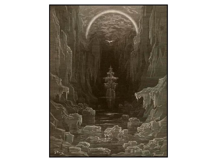 Stanzas 14, 15, 16 And through the drifts the snowy clifts Did send a dismal sheen: (55) Nor shapes of men nor beasts we ken— The ice was all between. • • The ice was here, the ice was there, The ice was all around: It cracked and growled, and roared and howled, (60) Like noises in a swound! At length did cross an Albatross: Thorough the fog it came; As if it had been a Christian soul, We hailed it in God's name. (65) • • More IMAGERY depicting the ICE. The word “dismal” is the first that suggests a pejorative meaning. There is no visible life in this region which will make the albatross’s arrival all the more conspicuous. A REPETITION that both reinforces the presence of the ice and also stylistically anticipates a later line that illustrates how the Mariner is surrounded by water that he ironically cannot drink. The ice is frightening, but as GOTHIC as this depiction seems, it would literally make these sounds. Coleridge often has some basis in reality even in his most fantastical descriptions. “Swound” is for sure a portmanteau word. It may fuse many words, such as sound, wind, and swoon. Finally, our focal subject emerges. Once again, PERSONIFICATION is employed and a SIMILE reinforces its nature. It is unmistakably good from this depiction and the sailors recognize it as such. This will heighten the nature of the crew’s sin later. We might wonder what kind of Albatross is depicted here and elsewhere. That is a matter for speculation.