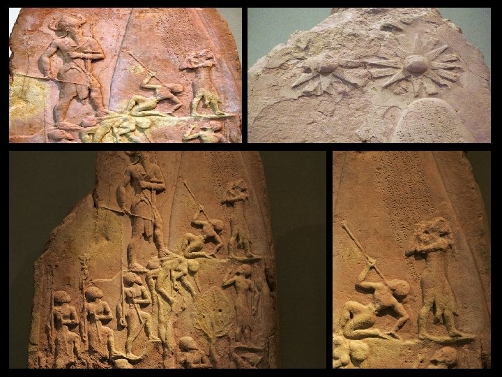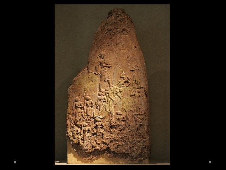 Akkadian Art Victory Stele of Narim-sin: - Tells a story, but not by using registers. - Celebrates Naram-sin’s victory over the Lullubi people of the Iranian Mountains (symbolic for climbing to heaven? ). - Inscribed twice to honor Naram-sin, but also to honor a separate king who stole this after capturing the city of Sippar. - Naram-sin leads his army up a wooded mountain with enemies falling, fleeing, dying, or begging for mercy. - He wears the horned helmet of divinity (this is the first time a king appears as a god in Mesopotamian art. ). - Three suns or stars shining over his victory (the gods support his actions and favor his rule. ).