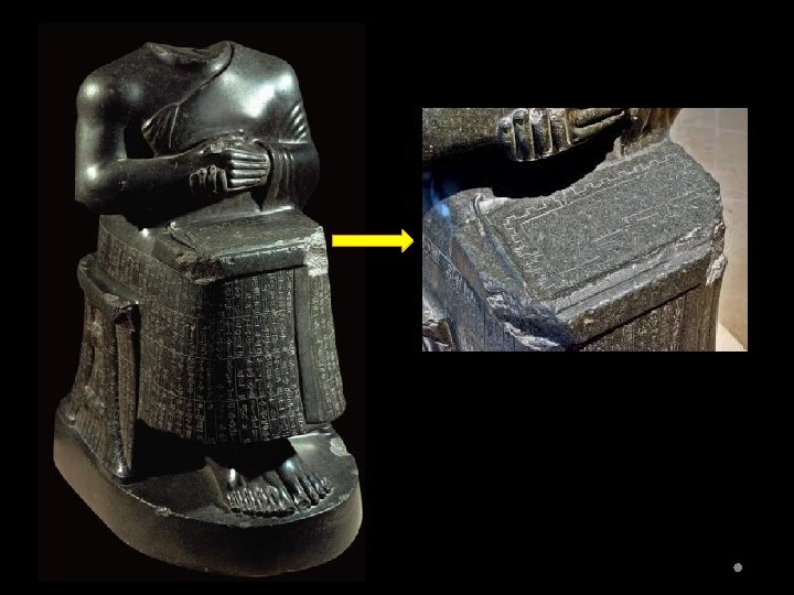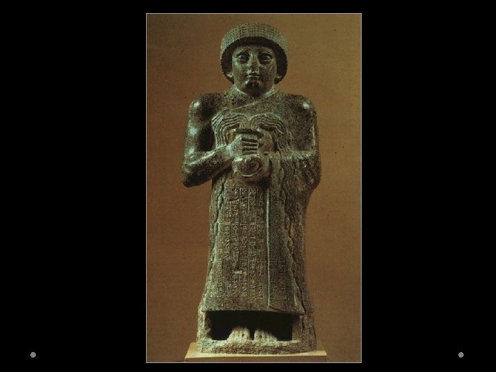 Neo-Sumerian Art Statues of Gudea W. Temple Plans or W. Overflowing Vase - Portray a pious ruler, Gudea of Lagash. - Made of diorite, these statues were extremely difficult to carve due to the characteristics of the stone, but would not deteriorate. - Use of diorite is also an indirect assertion of his wealth and power as the stone had to be imported to Mesopotamia. - “This statue has not been made from silver nor from lapis lazuli, nor from copper nor from lead, nor yet from bronze; it is made of diorite. ”