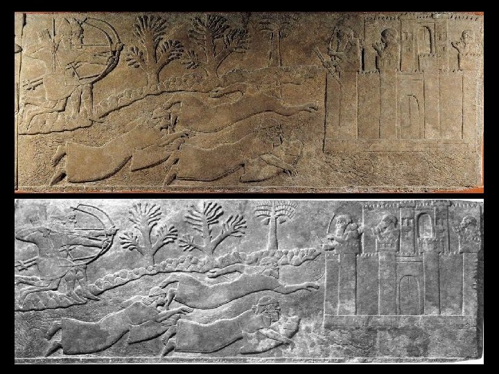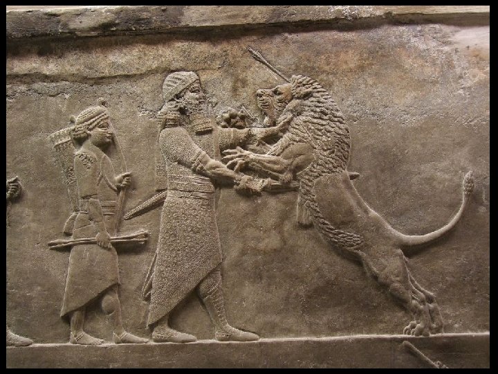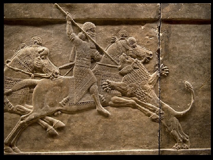 Assyrian Art Assyrian Hunting & War Reliefs - Meant to portray power and evoke fear for ages to come (success in hunting often meant success in warfare. ). - Archers chasing enemies details a battle of 878 BCE. - Detail of lions and their courage shows the respect that the Assyrians had for these creatures, but is twofold in helping the king earn more respect (Lions will not die easily in these scenes, therefore the king must try harder to kill them. ). - The slaying of the lions also symbolizes the king keeping his cities safe by keeping nature at bay. - Details of horses shows a more naturalistic depiction of animals.