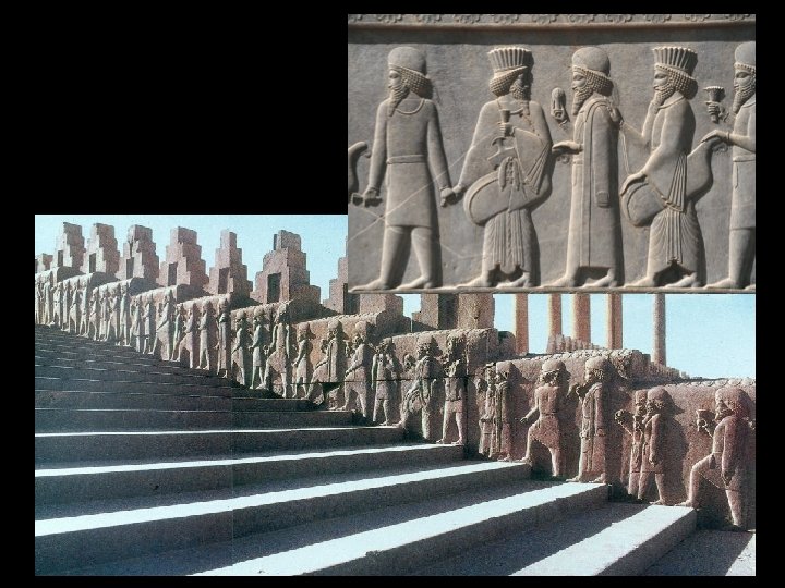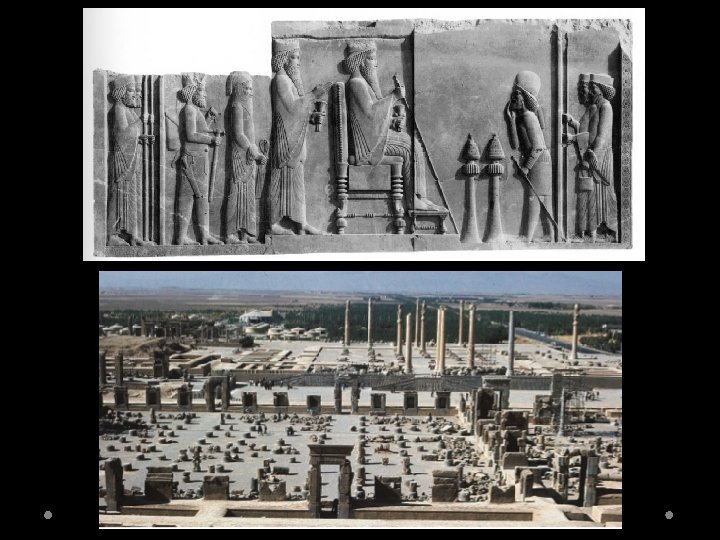 Persian Art Royal Apadana of Darius I & Xerxes I (Audience Hall) - The Persian Empire was the largest that the world had seen at the time and would only stop spreading after the Greeks held them. - The Palace at Persepolis is the defining work for understanding Persian architecture. - The columned audience hall could hold thousands and stood at sixty feet high and at more than 200 square feet and held 36 massive columns. - Wall reliefs and art work showcase royal guards, Persian nobles, dignitaries, and representatives from the 23 subject nations under Persia with each bringing tribute. - Each foreign subject wears the costume of his nation and carries a gift of the region. - Wall reliefs show subtle traces of Greek style.