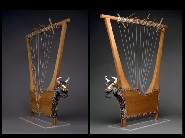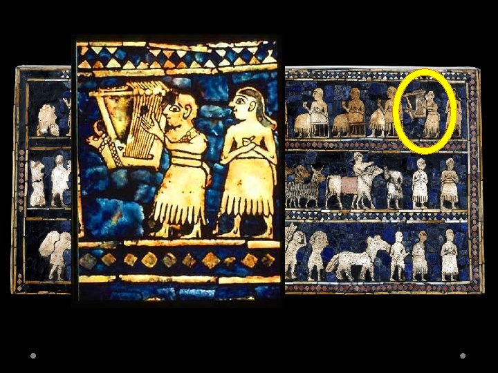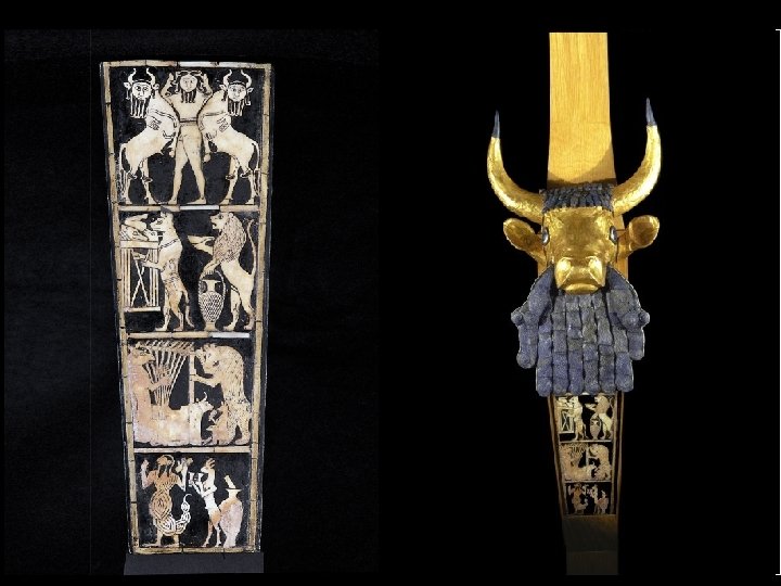 Sumerian Art Bull Headed Lyre Notes: - Bull Head adorns the front of the Lyre (gold leaf and lapiz lazuli) possibly the “bull of heaven” that Gilgamesh wrestles. - Features four fables: the “Gilgamesh Motif” on the top register - The other three fables contain a a lion, jackal, bear, deer, donkey, gazelle, and scorpion-man serving food. - The meaning behind these stories is unknown, but the animals could also inhabit the land of the dead and this narrative could have funerary purposes.