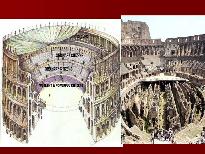 The Coliseum- a blend of Greek and Roman architecture The arches are supported by central columns. n The columns on the first floor are Doric. n The columns on the second floor are Ionic. n The columns on the third floor are Corinthian. n