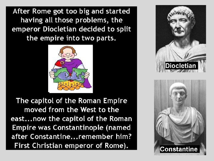 • The Western Roman Empire, due to a wide variety of problems (money, invasions, corruption, bad leaders, starvation, unemployment, etc. ), fell apart and was divided into many small kingdoms. • The Eastern Roman Empire, though, grew in wealth and power and ended up being known as the Byzantine Empire. Church of Hagia Sophia, one of the most visible symbols of the Byzantine Empire Type of Byzantine art called MOSAIC art