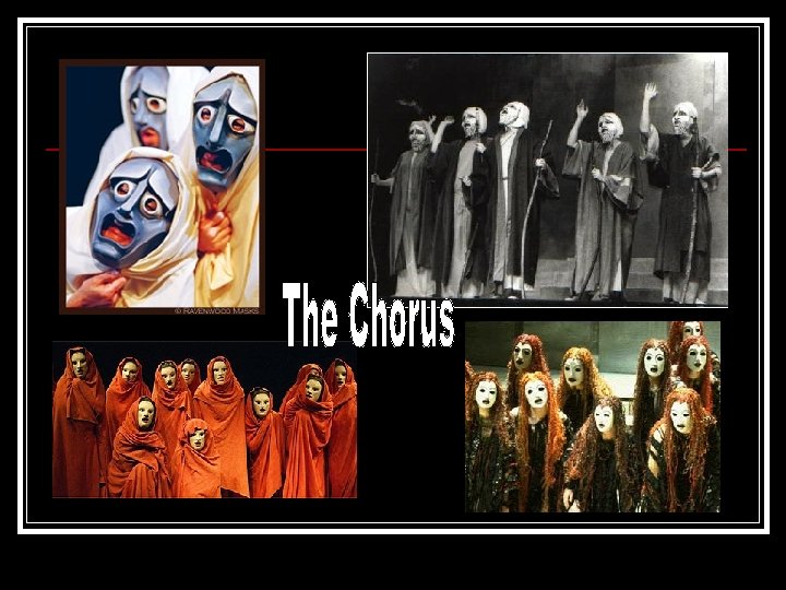 n Chorus: n n Main part of early Greek theatre Purpose: to narrate, explain, comment on action, and also engage in dialogue with actors. Originally about fifty performers in chorus. Number and responsibilities decreased as actors took over larger roles.