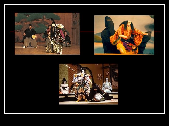 Japanese Theatre n n n Noh plays n Short, serious philosophical studies that combine poetry with music and dance n Meant for the aristocrats Bunraku n Doll theatre n Four-foot tall wooden marionettes Kabuki n Similar to Noh plays but intended for the common man n More melodramatic and sensational