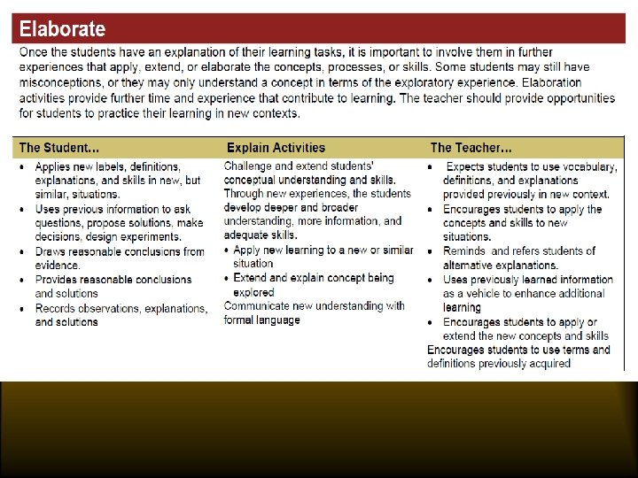 5 E Model of Instruction • • • Engage Explore Explain Elaborate Evaluate Formative Assessment should be the focus at these two stages
