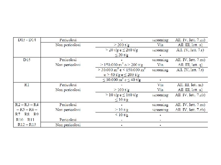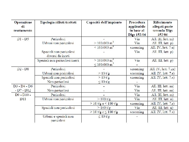Nell’allegato I alla direttiva 2011/92/Ue, ad esempio, figurano, ai punti 9 e 10, i seguenti impianti di trattamento rifiuti: “ 9. Impianti di smaltimento dei rifiuti mediante incenerimento, trattamento chimico quale definito nell’allegato I, punto D 9, della direttiva 2008/98/Ce relativa ai rifiuti, o interramento di rifiuti pericolosi, quali definiti all’articolo 3, punto 2, della detta direttiva. 10. Impianti di smaltimento dei rifiuti mediante incenerimento o trattamento chimico di rifiuti non pericolosi, quali definiti nell’allegato I, punto D 9, della direttiva 2008/98/Ce, con capacità superiore a 100 tonnellate al giorno”.