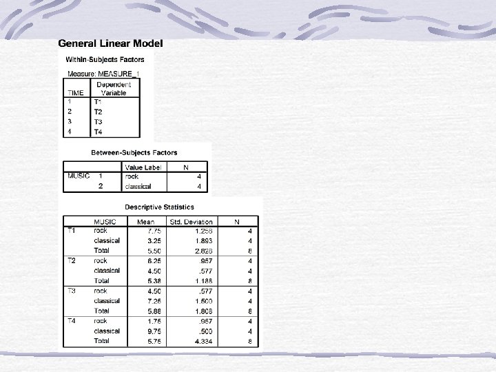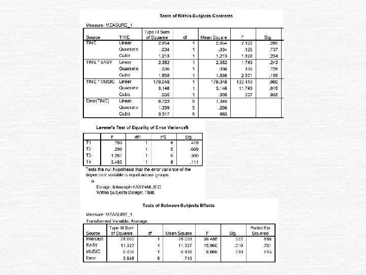 • • • • • • * * * A n a l y s i s o f V a r i a n c e -- design 1 * * * Tests involving 'TRIALS' Within-Subject Effect. Tests of Significance for T 2 using UNIQUE sums of squares Source of Variation SS DF MS F Sig of F WITHIN+RESIDUAL 26. 08 7 3. 73 REGRESSION. 70 1. 70. 19. 677 TRIALS 99. 16 1 99. 16 26. 62. 001 -----------------Effect Size Measures Partial Source of Variation ETA Sqd Regression. 026 TRIALS. 792 -----------------Regression analysis for WITHIN+RESIDUAL error term --- Individual Univariate. 9500 confidence intervals Dependent variable. . T 2 COVARIATE B Beta Std. Err. t-Value Sig. of t T 4 -. 21805 -. 16198. 502 -. 434. 677 COVARIATE Lower -95% CL- Upper ETA Sq. T 4 -1. 405. 969. 026 ------------------