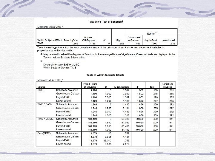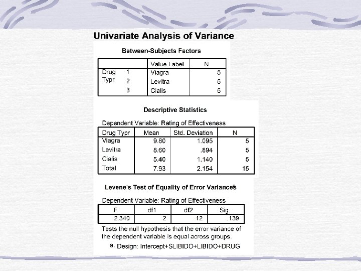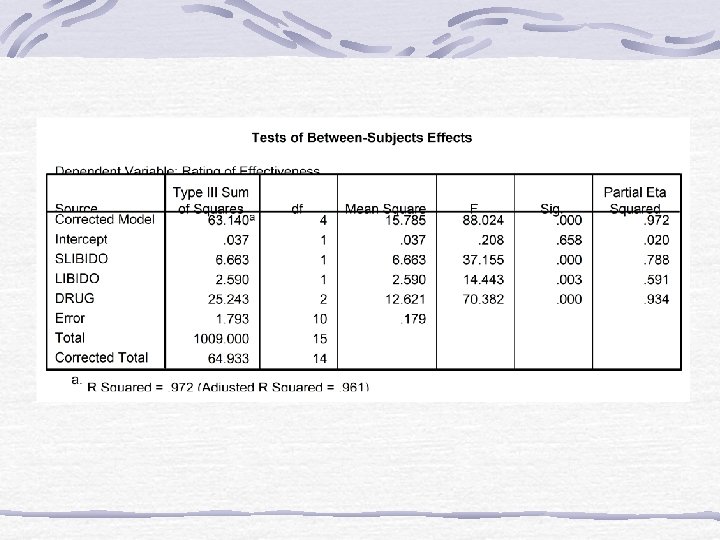 Effect Size • Effect size measures are the same except that you calculate them based on the adjusted SSs for effect and error