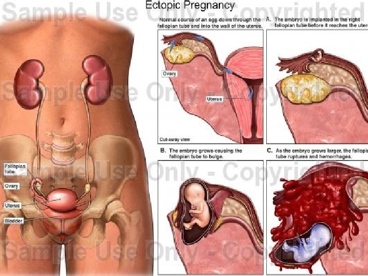 CHRONIC ECTOPIC PREGNANCY n n n It can be diagnosed by high clinical suspicion. Patient had previous attack of acute pain from which she has recovered. She may have amenorrhoea, vaginal bleeding with dull pain in abdomen, and with bladder and bowel complaints like dysuria, frequency or retention of urine, rectal tenesmus.