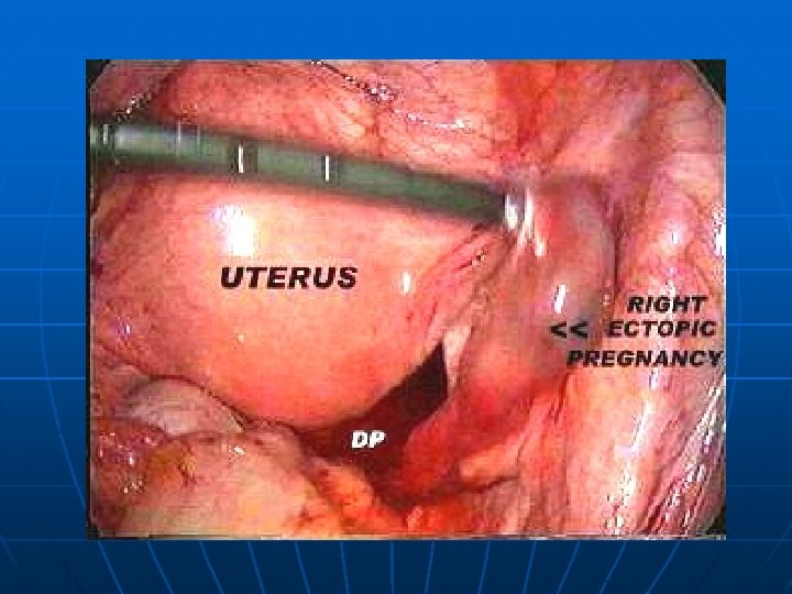 2. Culdocentesis: - (70 -90%) - Can be done with 16 -18 G lumbar puncture needle through posterior fornix into POD. - Positive tap is 0. 5 ml of non clotting blood. n Other Investigations: 1. Ultra Sonographya) Transvaginal Sonography (TVS): is more sensitive -It detect intrauterine gestational sac at 4 -5 wks and at S-β h. CG level as low as 1500 IU/L.