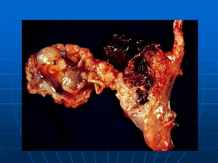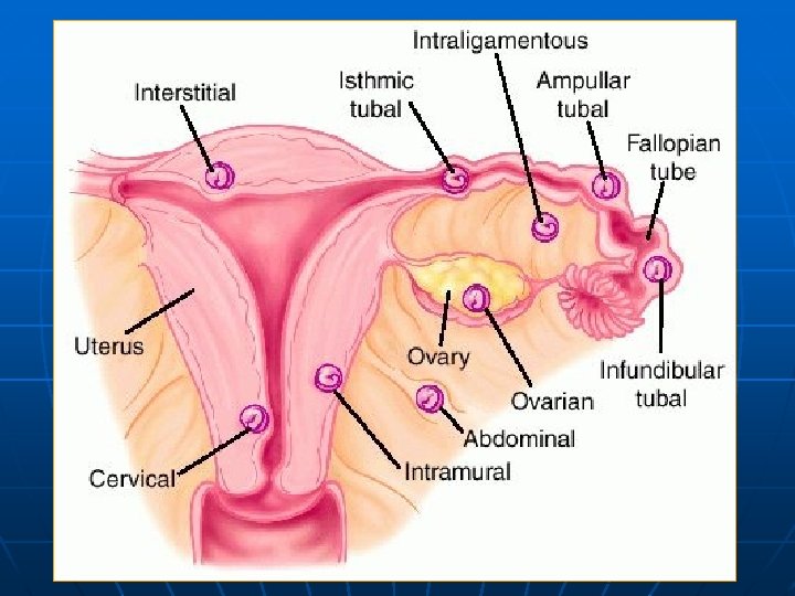IMPLANTATIONS SITES EXTRAUTERINE TUBAL 97% OVARIAN (1: 40, 000) -Ampulla 80% -Isthmus 12% -Infundibulum 6% -Interstitial 2% UTERINE -CERVICAL (1: 18, 000) -ANGULAR -CORNUAL ABDOMINAL (1: 10, 000) PRIMARY SECONDARY Intraperitoneal Extraperitoneal Broad Ligament (rare)
