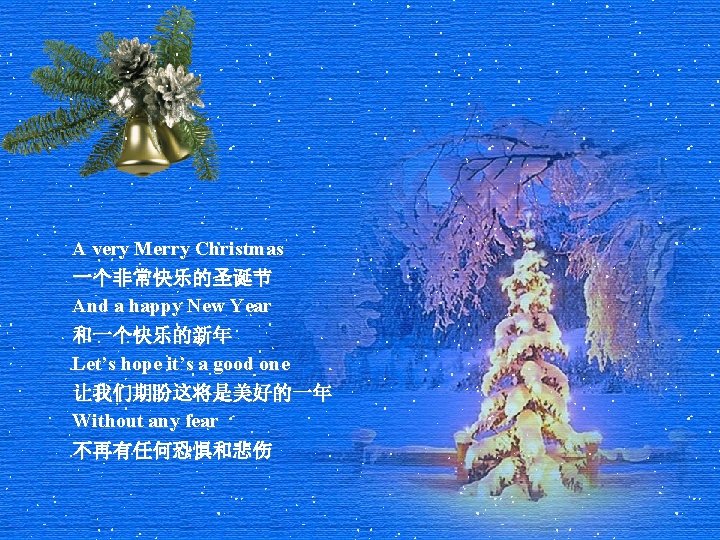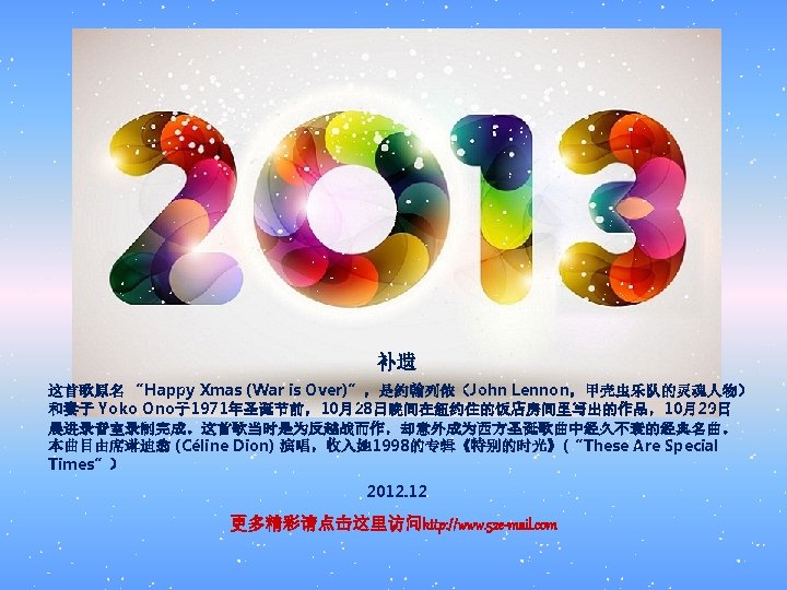 And so this is Christmas Cline Dion Emailwww Slides: 12 Download presentation And so this is Christmas 又一个圣诞节即将来临 席琳迪翁 (Céline Dion) 演唱 E-mail文化传播网www. 52 e-mail. com So this is Christmas 又一个圣诞节即将来临 And what have you done 你做好准备了吗 Another year over 不觉中旧的一年转瞬即逝 And a new one just begun 新的一年即将开始 And so this is Christmas I hope you have fun 又一个圣诞节即将来临 衷心希望你节日快乐 The near and the dear ones 祝福我所有亲近挚爱的人们 The old and the young 祝福所有的长者与幼童 And so this is Christmas For weak and for strong 又一个圣诞节即将来临 无论对于弱者还是强者 For rich and the poor ones 无论对于富翁还是穷人 The war is so long 战乱不已过于漫长 And so happy Christmas For black and for white For yellow and red ones Lets’ stop all the fight 祝福所有的朋友圣诞快乐 无论黑色人种,白色人种 黄色人种,或是红色人种 让我们停止一切无谓的争端 A very Merry Christmas And a happy New Year Let’s hope it’s a good one Without any fear 祝你圣诞快乐 祝你新年快乐 让我们期盼这将是美好的一年 不再有任何恐惧和悲伤 And so this is Christmas And what have we done Another year over A new one just begun 又一个圣诞节即将来临 我们已经准备好了吗 不觉中旧的一年转瞬即逝 新的一年即将开始 And so happy Christmas 祝你圣诞快乐 We hope you have fun 祝你节日快乐 The near and the dear ones 祝福我所有亲近挚爱的人们 The old and the young 祝福所有的长者与幼童 A very Merry Christmas 渡过一个非常快乐的圣诞节 And a happy New Year 和快乐的新年 Let's hope it's a good one 让我们期盼这将是美好的一年 Without any fear 不再有任何恐惧和悲伤 And so this is Christmas And what have we done Another year over A new one just begun 又一个圣诞节即将来临 我们已经准备好了吗 旧的一年转瞬即逝 新的一年即将开始