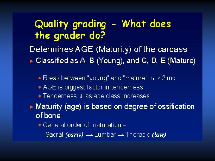 What is the purpose beef carcass grading? • To allow beef producers, packers, and retailers to be paid for the level of quality product they distribute. • The USDA implemented meat grading to ensure that the product is of the right quality that consumers want. • To create a basis for comparison and data in the beef industry. • It is NOT mandatory for beef producers to use – But many markets such as Safeway and Kroger require it.