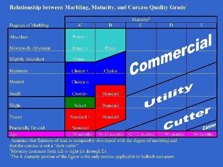 What is the purpose of Quality Grades? • Reflects the differences in the eating quality of meat based on: Marbling scores - the amount of fat interspersed in the muscle. Maturity scores - reflects the age of the animal at slaughter.