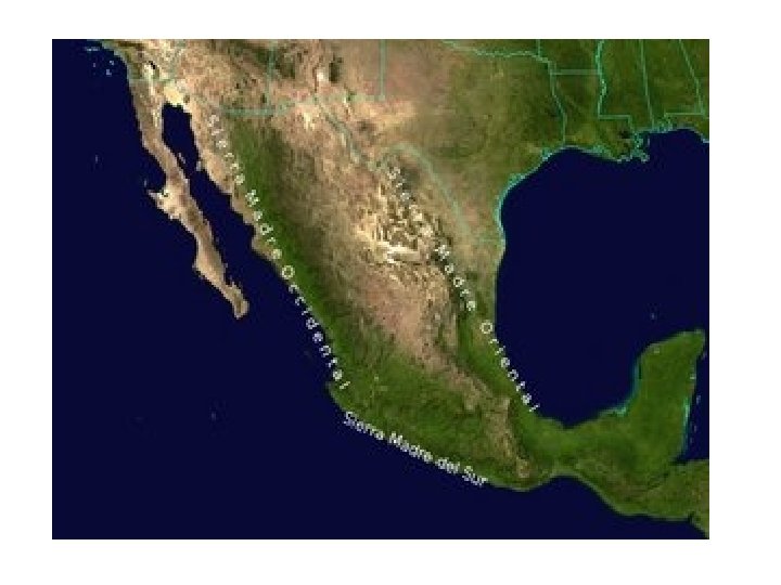 Sierra Madre Occidental • Sierra Madre Occidental is a range in Mexico 300 miles wide that runs parallel with the Gulf of California and the Pacific Ocean. • Its average elevation is 10, 000 feet, and its mountains are generally steeper and more rugged than those of the Sierra Madre. • Many peaks of the Occidental range have some snow cover, and most are volcanic.