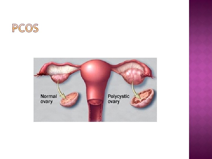 � Only affects women � Elevated level of androgens (male hormones) � Irregular or no menstrual cycle � May cause many small cysts to develop in the ovaries � The most common hormonal reproductive problem in women of childbearing age